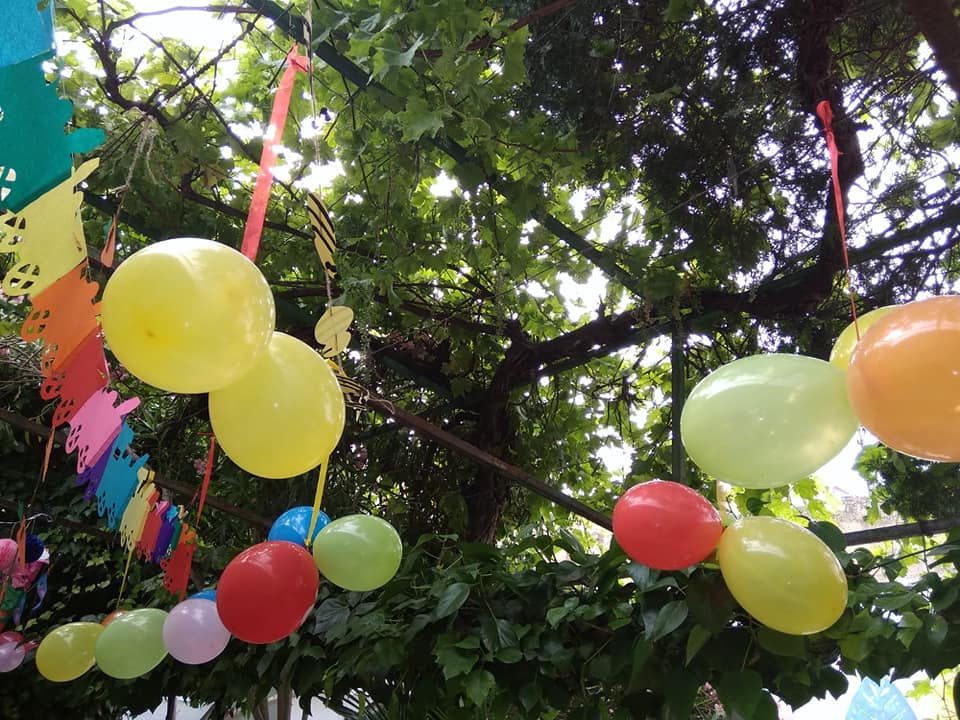 Adornamos el patio con globos y guirnaldas para que tenga ambiente festivo.