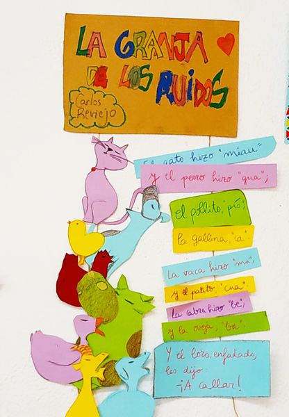 Su poesía aparece en la pared de nuestra clase. Un bonito trabajo de familia que llegó a nosotras en el Día Internacional de la poesía.