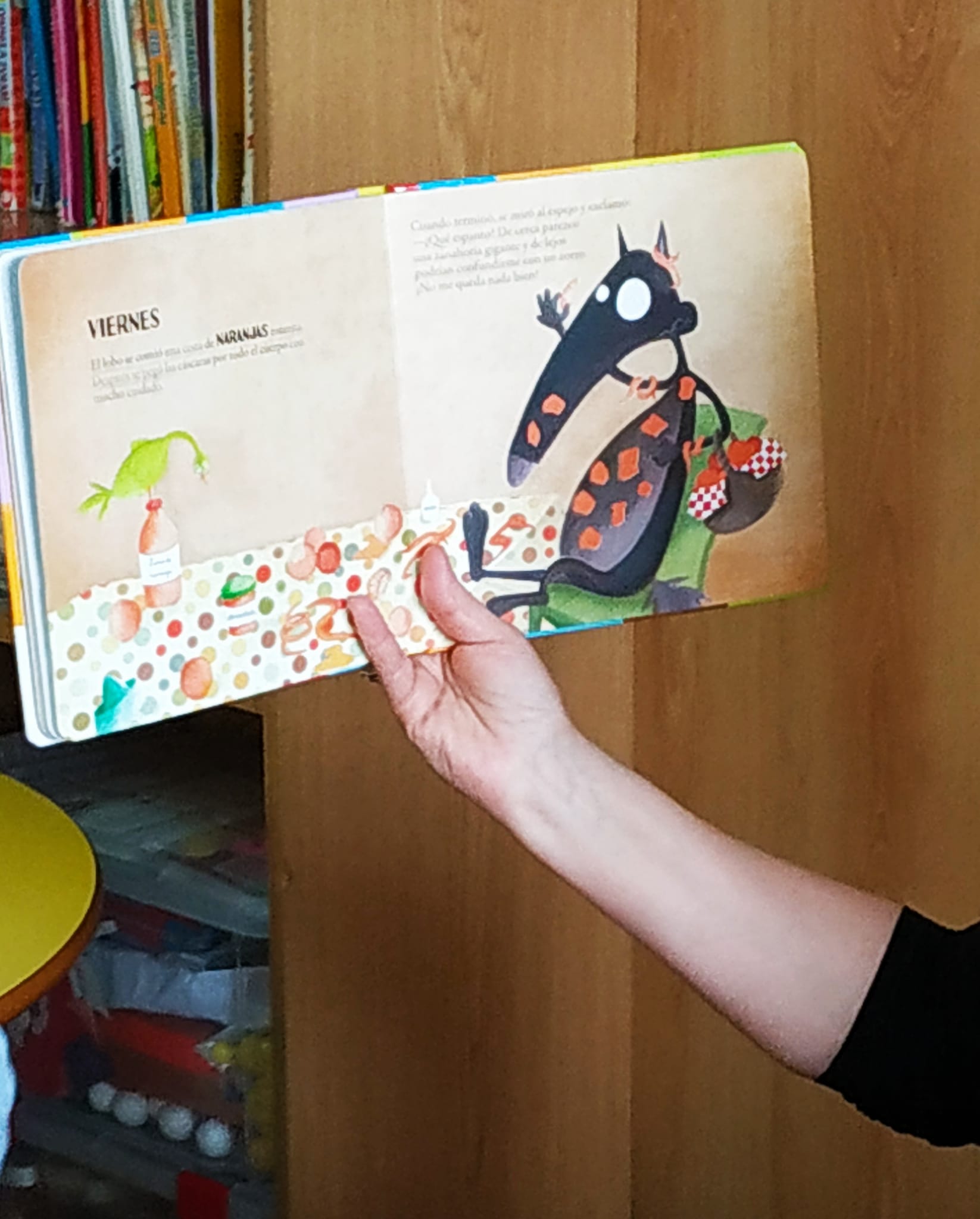 Nos divertimos con las andanzas del lobo y a la vez , aprendemos los colores y apreciamos diferentes texturas.