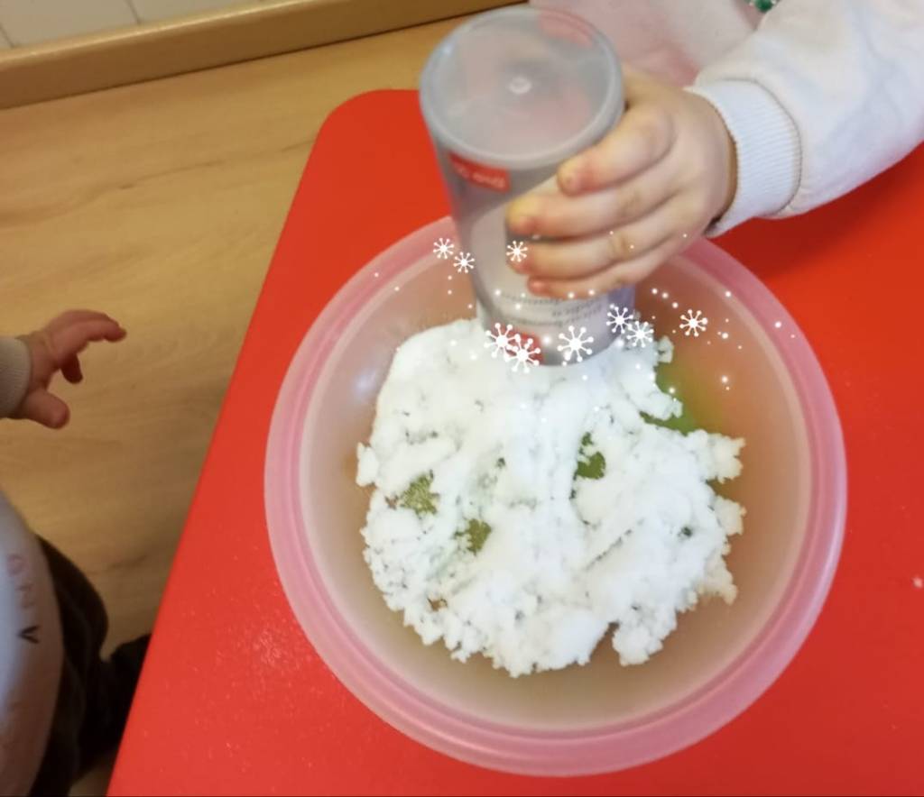 Somos artífices de «nieve de mentirijillas». Es blanca, está fría, es húmeda… La tocamos con nuestras manos y un poquito con el pie.¡Qué bien!