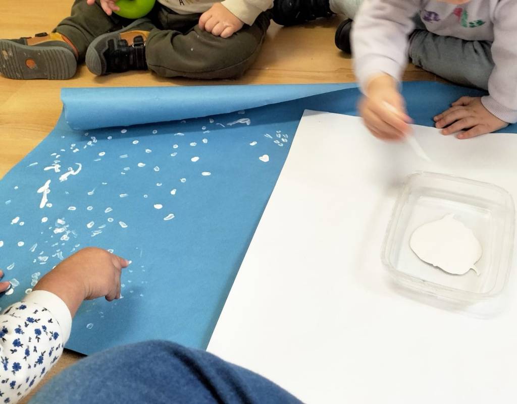 _ Somos pintores/as de blancos copos que cubren el cielo y los árboles sobre el papel.