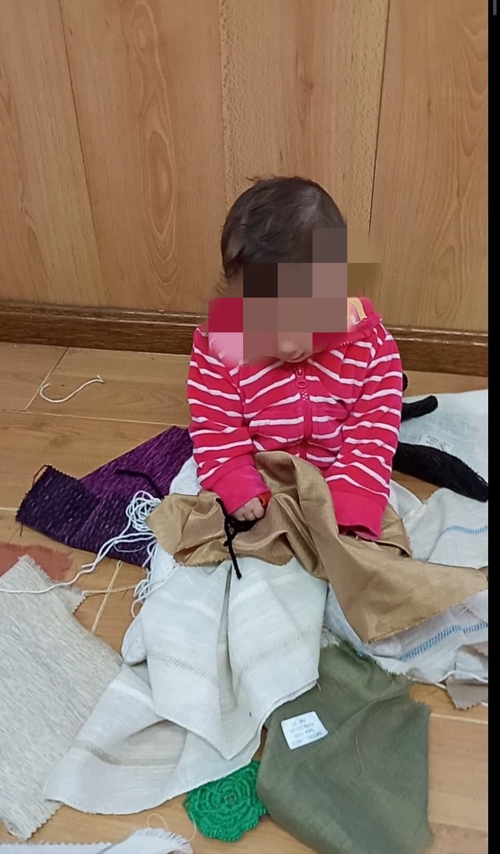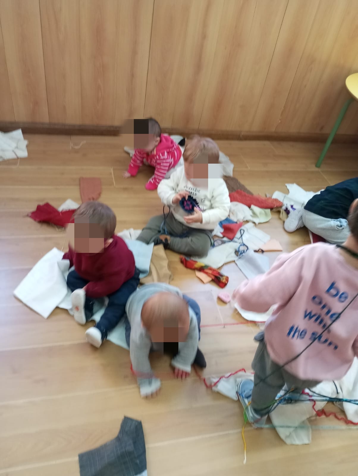 Acompañados de música relajante en un «ambiente sosegado», nuestros niños y niñas pequeñ@s juegan con telas y lanas.